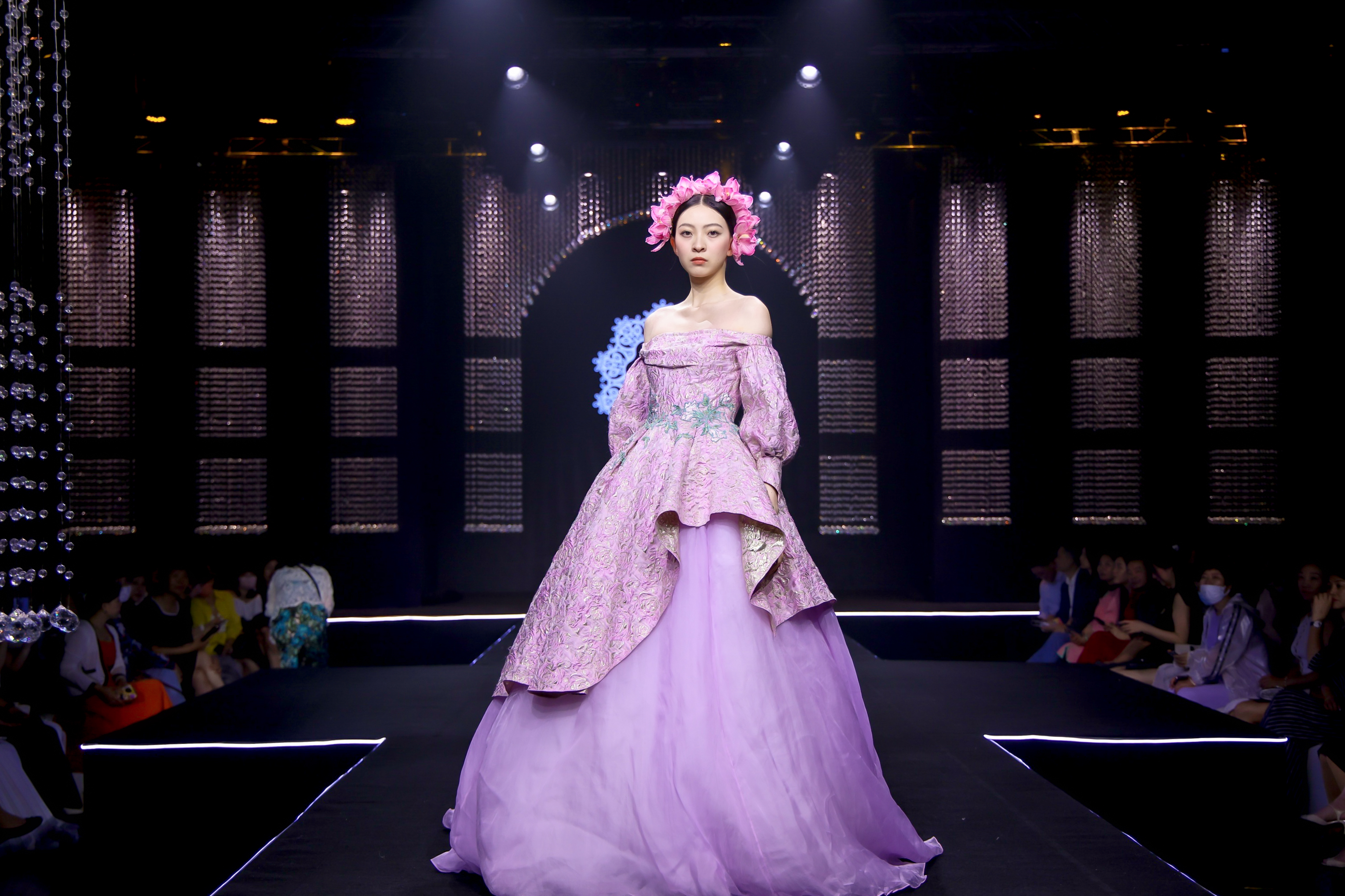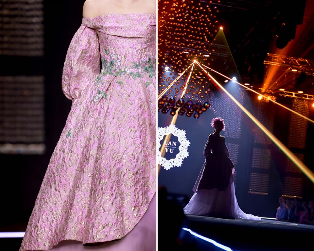 盛典秀場(chǎng)真實(shí)還原了巴黎時(shí)裝周舞臺(tái),讓觀眾擁有了極致的感官體驗(yàn)。40余套不同風(fēng)格的禮服傾情展出設(shè)計(jì)中如同水墨畫恣意揮灑的筆墨,將山河間幽深、清遠(yuǎn)、縹緲的東方韻味表現(xiàn)得淋漓盡致。