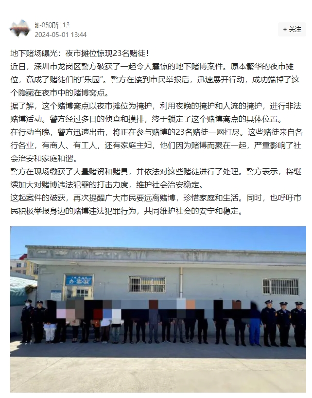有網(wǎng)民在某社交平臺發(fā)帖稱:“近日,深圳市龍崗區(qū)破獲了一起令人震驚的地下賭博案件。原本繁華的夜市攤位,竟成了賭徒們的‘樂園’?!饼垗弲^(qū)相關(guān)部門第一時(shí)間對該內(nèi)容進(jìn)行核查,確認(rèn)此消息不實(shí),龍崗區(qū)沒有發(fā)生此類案件。