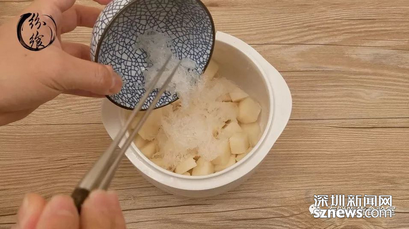 切塊雪梨放入燉盅中,將泡發(fā)好的燕窩均勻鋪在雪梨表面。