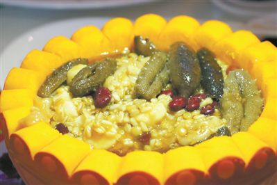 時常在宴席中作為粵菜上品出現(xiàn)的南瓜盅,里面不一定放排骨。這款遼參南瓜盅加花膠仔,是地地道道的養(yǎng)生菜式,兼具滋補效果和藥用價值的遼參與花膠“聯(lián)姻”。