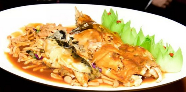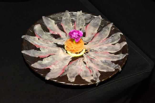 本次品鑒會晚宴以富谷紅鰭東方鲀?yōu)橹黝},共呈現(xiàn)了七道河豚及相關產(chǎn)品菜品:包括:紅燒河豚、白汁河豚、白溜河豚魚片、紅燒海參靈芝菇、河豚魚皮絲、河豚魚丸湯、河豚魚水餃等,與會嘉賓共同品鑒,對河豚食材鮮美贊不絕口。(常軍平)