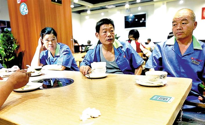 在店里吃飯的人群里,有一張臺(tái)全是清一色的藍(lán)色工作服,特別顯眼。“我們每天都會(huì)來(lái)這里吃早餐,差不多有一年時(shí)間了,這里的老板太好了,希望他能一直開下去?!边@幾個(gè)大叔、大嬸是周邊物業(yè)的清潔工人,他們每天早上5點(diǎn)鐘就上崗工作,忙完就到了6-7點(diǎn),又餓又累,有一碗熱騰騰的早餐是一件非常幸福的事,而這種開心快樂(lè)的事情在這里發(fā)生了。吳姓清潔工說(shuō),這里的老板和員工很好,大家來(lái)這里吃粥,沒(méi)有感到半點(diǎn)不自在,就像在自己家一樣。