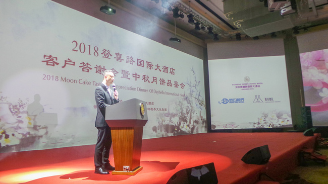 深圳新聞網(wǎng)訊 7月26日,登喜路國際大酒店在二樓國際宴會廳舉辦了2018客戶答謝會暨中秋月餅品鑒會。100余位酒店長住客、商務客戶及媒體嘉賓齊聚一堂,舉杯同慶共同品鑒登喜路國際大酒店推出的中秋月餅。