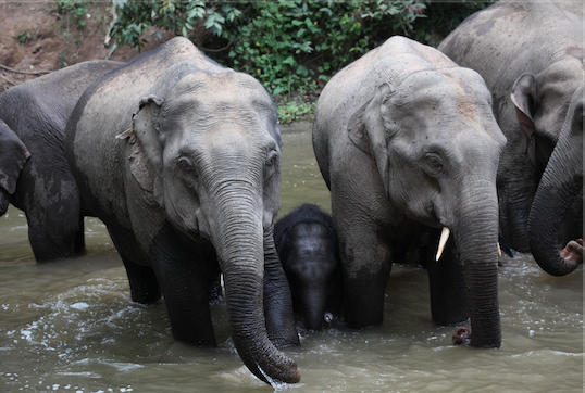 剛出生的萌寶在“大人”的保護(hù)下渡河(圖片來(lái)源:西雙版納亞洲象保護(hù)協(xié)會(huì))