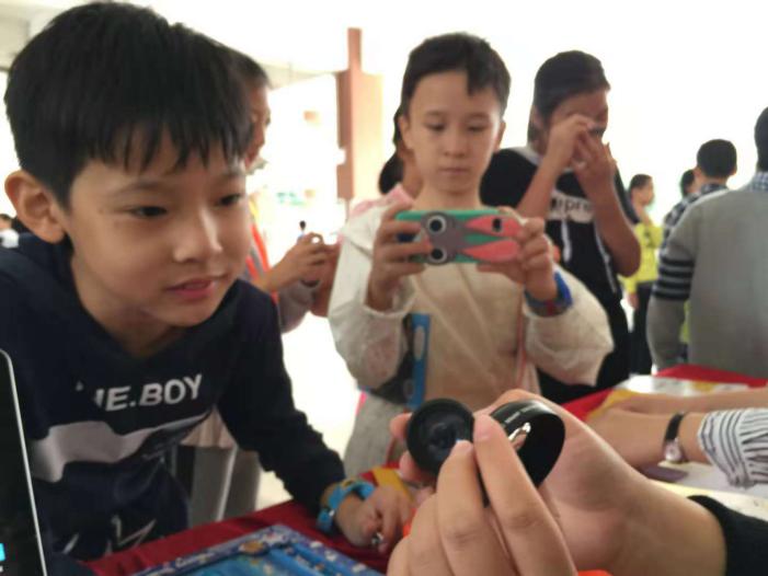 科普益智互動(dòng)游戲精彩紛呈,深圳阿卡索資訊股份有限公司的華容道大闖關(guān)、筷子夾彈珠互動(dòng)游戲極大激發(fā)了同學(xué)們的參與熱情。深圳市夢(mèng)飛翔文化傳播有限公司及深圳諾必達(dá)節(jié)能環(huán)保有限公司的智能陪伴機(jī)器人能詩(shī)歌能朗誦,“通今博古”能答疑解惑,成為同學(xué)們的良師益友。各種技能培訓(xùn)在其中兩家學(xué)校同步開(kāi)展,包括中廣和(深圳)科技有限公司的兒童護(hù)理實(shí)用技能、深圳光影教育投資有限公司的手機(jī)和單反使用講座、深圳市海文深生物科技有限公司的牙膏制作工藝展示等項(xiàng)目,讓孩子們收獲不少生活技能。