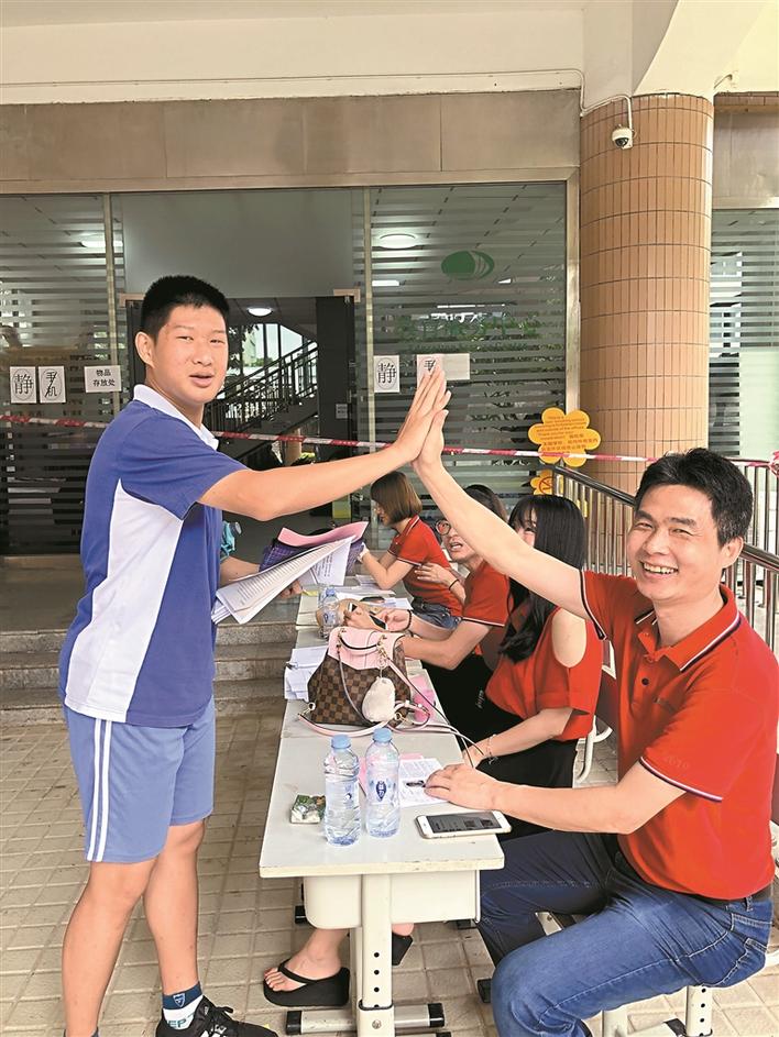 ▲丁立群(右)與學(xué)生擊掌。受訪者供圖