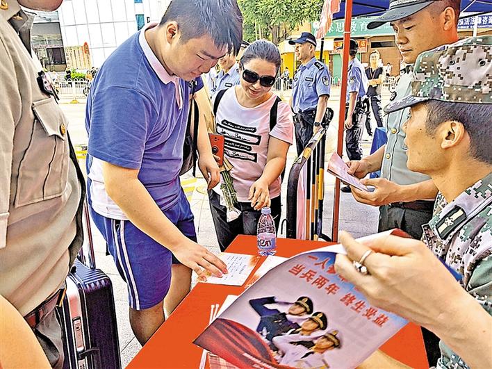6月8日下午,征兵工作人員在龍華中學(xué)考點(diǎn)外開(kāi)展了針對(duì)高考考生的征兵宣傳。