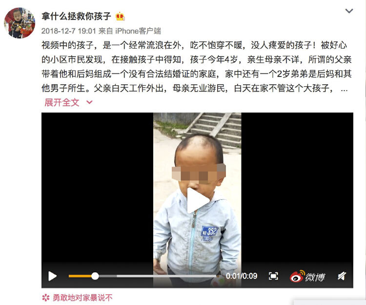 該微博網(wǎng)友敘述,小孩經(jīng)常在園山街道馬五村游蕩、席地而睡。好心人中告訴他,孩子今年4歲,親生母親不詳,所謂的父親帶著他和后媽組成一個(gè)沒有合法結(jié)婚證的家庭,家中還有一個(gè)2歲弟弟是后媽和其他男子所生,2歲弟弟也經(jīng)常獨(dú)自扔家中一天半天沒人看管。網(wǎng)友發(fā)布的一段視頻顯示,2歲的弟弟自己爬到了外面大馬路上“玩?!?。
