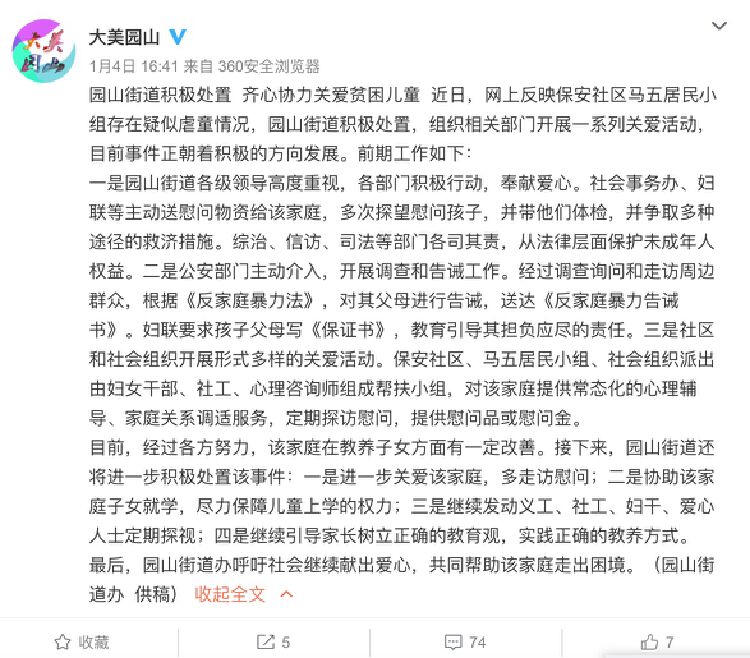 深圳商報(bào)2019年1月8日訊 2018年12月7日,微博網(wǎng)友“@拿什么拯救你孩子”發(fā)布微博消息稱,深圳龍崗園山一名4歲小孩經(jīng)常流浪在外,遭父母毆打。該微博發(fā)出后,立即引起了網(wǎng)友們的關(guān)注,園山街道辦得知消息后立即開展救助。2019年1月4日,園山街道辦事處官方微博@大美園山發(fā)布通告稱,網(wǎng)上反映保安社區(qū)馬五居民小組存在疑似虐童情況,園山街道積極處置,組織相關(guān)部門開展一系列關(guān)愛活動(dòng),目前事件正朝著積極的方向發(fā)展。