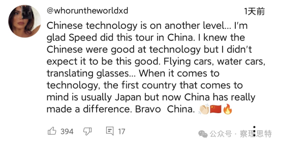 (中國(guó)的科技水平又上了一個(gè)臺(tái)階......我很高興Speed在中國(guó)舉辦了這次巡演。我知道中國(guó)人擅長(zhǎng)科技,但我沒(méi)想到會(huì)這么好。飛行汽車、水上汽車、翻譯眼鏡......說(shuō)到科技,首先想到的國(guó)家通常是日本,但現(xiàn)在中國(guó)真的做出了改變。中國(guó)萬(wàn)歲?。?/p>