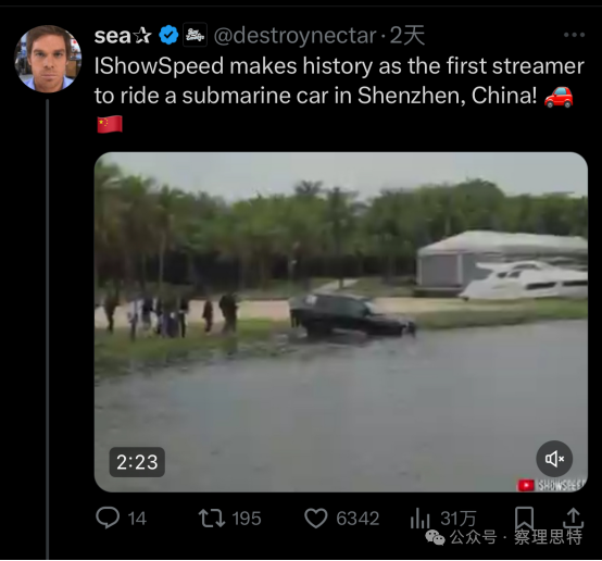 (IShowSpeed 創(chuàng)造了歷史,成為第一個(gè)在中國(guó)深圳乘坐潛水艇車的流量博主!)
