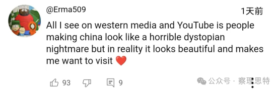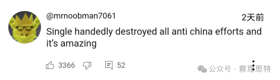 在YouTube上,“單槍匹馬摧毀了所有的反華努力,這太神奇了”“中國(guó)被低估了,簡(jiǎn)直難以置信”“這次旅行是中國(guó)有史以來(lái)最好的宣傳”“在我看來(lái)深圳是中國(guó)最好的城市。有邁阿密的天氣、空氣和景觀,有紐約的摩天大樓,有上海的國(guó)際氛圍,有重慶的科技和賽博朋克美學(xué),還帶點(diǎn)廣東味”這樣的感嘆不勝枚舉。