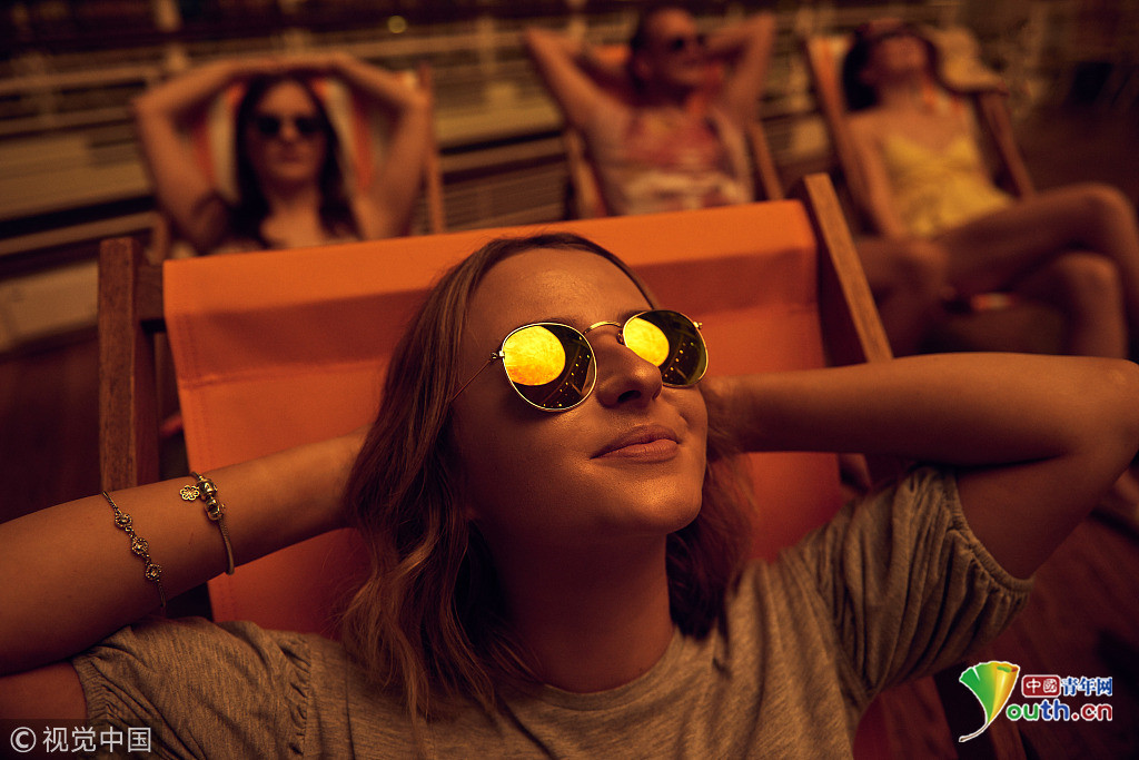 當(dāng)?shù)貢r間2018年9月18日,英國曼切斯特,顧客們在特拉福德購物中心的一個巨型的“太陽”下享受室內(nèi)日光浴,感受英國未完的史上最熱夏天。這個人造“太陽”的亮度相當(dāng)于1.2萬個燈泡。圖片來源:視覺中國