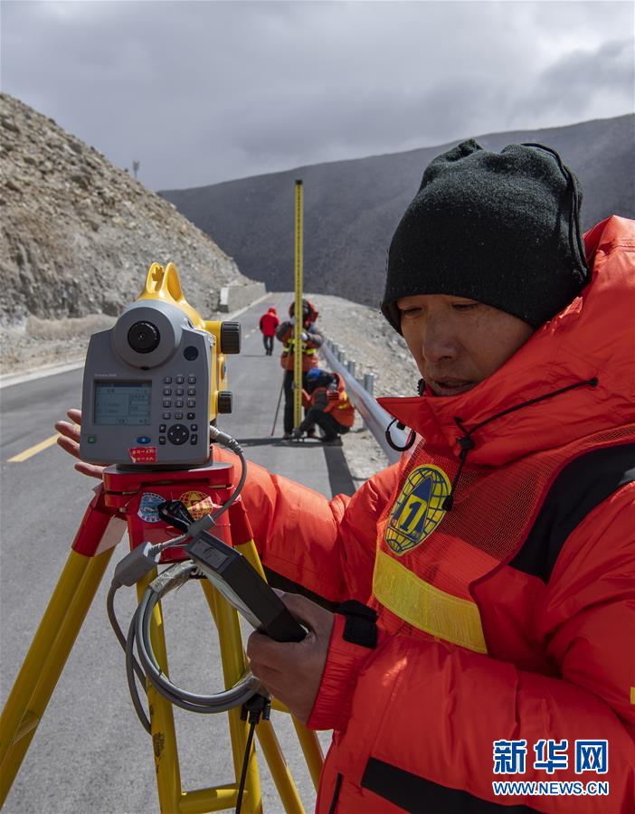 國測一大隊隊員吳元明在西藏定日縣曲當鄉(xiāng)境內(nèi)進行水準測量(4月18日攝)。水準測量是一種利用提供水平視線的儀器(如水準儀、水準標尺),測定地面不同點之間的高差,并以此推算高度的一種方法,是經(jīng)典大地測量的重要技術之一。在目前正在進行的2020珠峰高程測量中,部分國測一大隊隊員承擔了水準測量的任務。新華社記者孫非攝