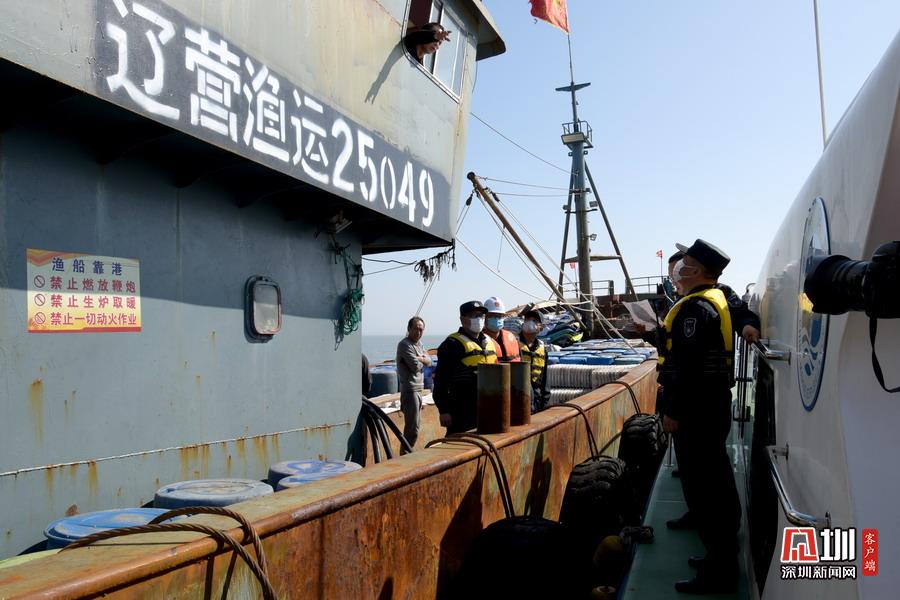 2020年5月6日,山東省榮成市石島管理區(qū)石島灣海域,榮成市漁政部門執(zhí)法人員對(duì)一運(yùn)輸船進(jìn)行檢查。