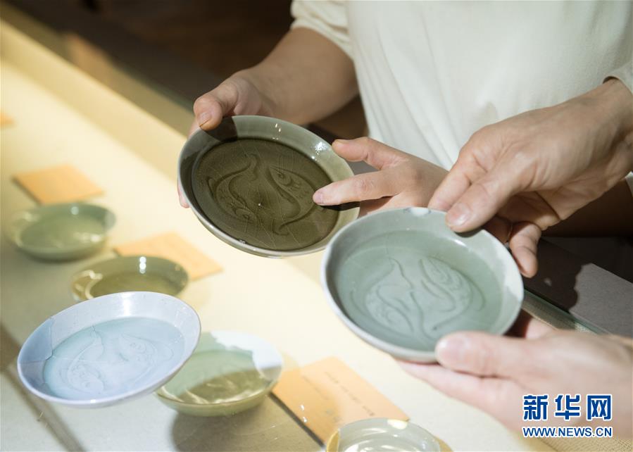5月8日,“90后”瓷人湯佳(左)將自己制作的魚紋盤帶到龍泉青瓷裝飾紋樣研究所,跟項宏金收藏的古瓷器比對。1965年出生的項宏金,被浙江龍泉年輕一代瓷人稱為“項哥”,他從20世紀(jì)90年代開始收集龍泉青瓷標(biāo)本,研究青瓷紋樣。2014年出版著作《龍泉青瓷裝飾紋樣》,次年開設(shè)龍泉青瓷裝飾紋樣研究所,將自己收藏的千余件標(biāo)本跟瓷器愛好者、創(chuàng)作者免費分享。新華社記者翁忻旸攝