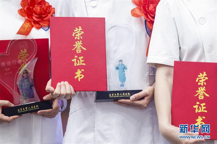 5月11日,工作人員整理印有援鄂隊員工作照的獎杯。在國際護士節(jié)到來之際,北京大學(xué)人民醫(yī)院11日舉辦慶祝護士節(jié)暨優(yōu)秀集體和個人表彰活動,并邀請援鄂醫(yī)療隊護士代表分享戰(zhàn)“疫”故事。我國今年護士節(jié)的主題為“致敬護士隊伍,攜手戰(zhàn)勝疫情”。新華社記者張玉薇攝