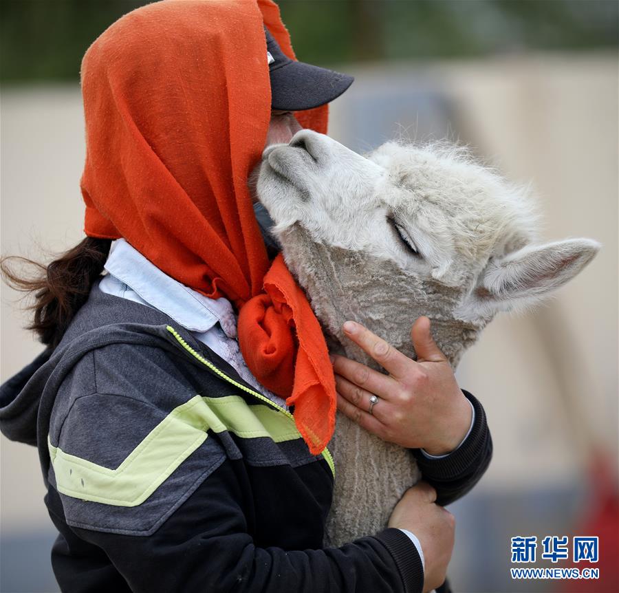 5月12日,一只剪下絨毛的羊駝依偎在飼養(yǎng)員懷里。新華社記者姚劍鋒攝