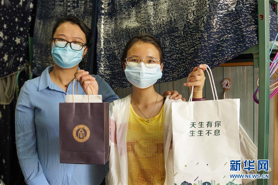 5月15日,在西南大學(xué)女生宿舍內(nèi),一名學(xué)生(右)展示學(xué)校和學(xué)院送來的裝有口罩、防疫指南的紙袋。當(dāng)日,重慶西南大學(xué)迎來疫情以來首批返校大學(xué)生。據(jù)介紹,按照疫情防控的需要,重慶市高校2020年春季學(xué)期從5月11日起按照“一校一策”原則,實(shí)行錯(cuò)峰錯(cuò)時(shí)分批次有序開學(xué)復(fù)課。新華社記者劉潺攝