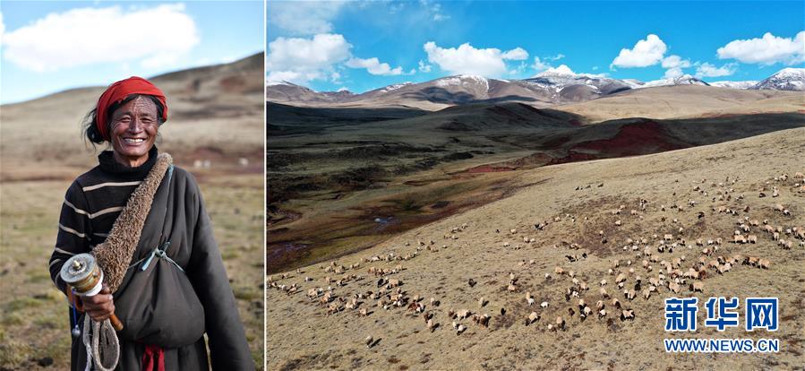 拼版照片:左圖為西藏昌都市貢覺縣拉妥鄉(xiāng)宗巴村村民多吉;右圖為在貢覺縣阿旺鄉(xiāng)牧場,多吉幫一位綿羊養(yǎng)殖大戶放牧(無人機(jī)照片)。多吉自家有20只羊和10頭牛,之前一直在村里放牧。2019年他來到阿旺鄉(xiāng)幫綿羊養(yǎng)殖大戶放牧,每月有3900元的收入(5月2日攝)。