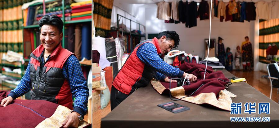 拼版照片:左圖為西藏昌都市江達縣字嘎鄉(xiāng)塔字村村民扎西江措;右圖為扎西江措在西藏昌都市江達縣格?;褡宸椉庸やN售公司制作藏裝。扎西江措學(xué)習(xí)藏裝縫制不到兩年時間,已經(jīng)是一名熟練的制衣工,現(xiàn)在月收入4000多元。在此之前,扎西江措靠放牧、四處打零工養(yǎng)活一家人(4月30日攝)。新華社記者詹彥攝