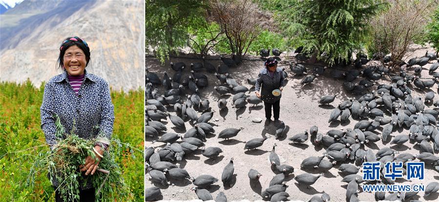 拼版照片:左圖為西藏昌都市芒康縣納西民族鄉(xiāng)加達村村民白姆;右圖為白姆在芒康縣納西民族鄉(xiāng)三江農(nóng)民專業(yè)合作社喂雞。白姆在三江農(nóng)民專業(yè)合作社打工,主要負責(zé)喂雞和喂牛,每月有3000元的收入(5月4日攝)。新華社記者詹彥攝