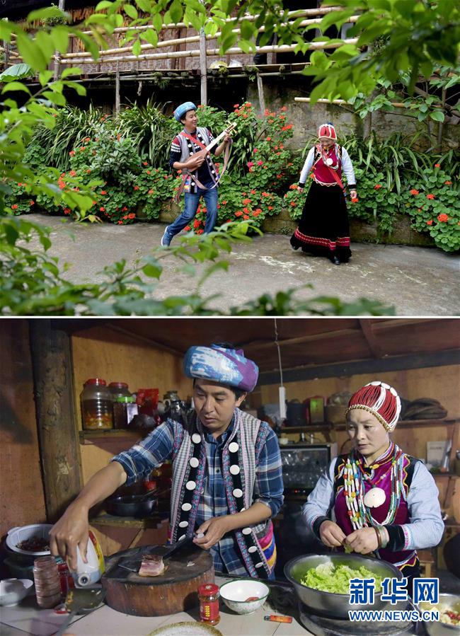 拼版照片上圖:郁伍林和魯冰花在客棧院子里彈唱歌舞(2017年5月27日攝);下圖:郁伍林和魯冰花為客人準備晚餐(2017年5月26日攝)。云南省怒江傈僳族自治州福貢縣匹河怒族鄉(xiāng)老姆登村的郁伍林和妻子魯冰花,是該村開辦農(nóng)家樂和客棧的致富帶頭人。夫妻倆還創(chuàng)建了茶葉品牌,幫助老姆登村怒族群眾把種植的生態(tài)茶葉銷往國內(nèi)外。在他們的引導和帶動下,山寨的父老鄉(xiāng)親通過經(jīng)營農(nóng)家樂客棧和種植茶葉逐步脫貧致富,日子越過越紅火。黨的十八大以來,我們堅持以人民為中心的發(fā)展思想,明確了到2020年我國現(xiàn)行標準下農(nóng)村貧困人口實現(xiàn)脫貧、貧困縣全部摘帽、解決區(qū)域性整體貧困的目標任務。目前看,脫貧進度符合預期,成就舉世矚目。這些成績的取得,凝聚了全黨全國各族人民智慧和心血,是廣大干部群眾扎扎實實干出來的。脫貧摘帽不是終點,而是新生活、新奮斗的起點。新華社記者楊宗友攝