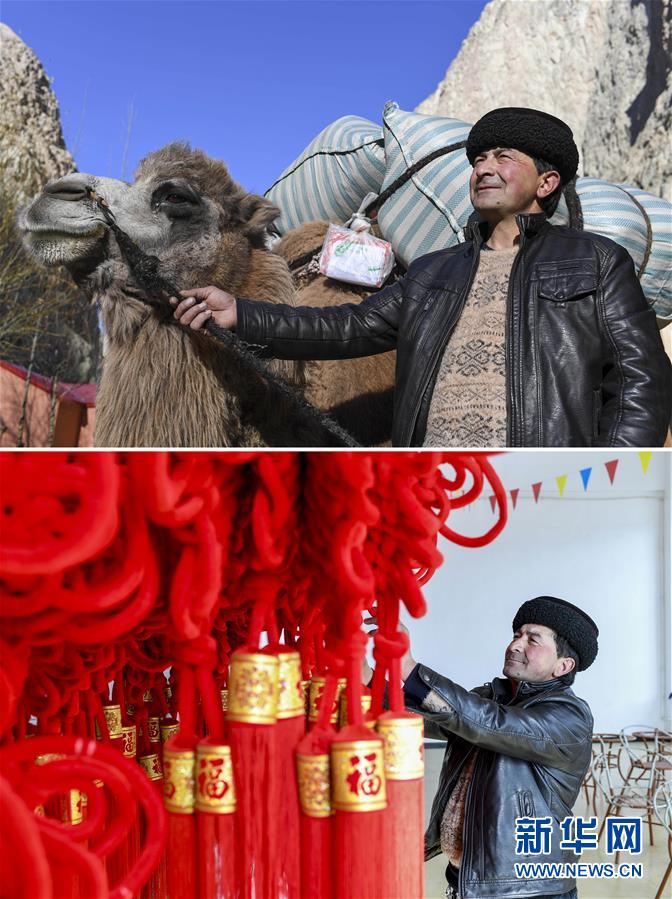 拼版照片上圖:都熱·加爾曼牽著馱有搬遷行李的駱駝走在喀喇昆侖山中(2018年11月17日攝);在塔什庫爾干塔吉克自治縣塔提庫力易地扶貧搬遷安置點的衛(wèi)星工廠,都熱·加爾曼在參觀由村民編制的手工藝品,他計劃讓妻子來這里上班(2018年11月18日攝)。2018年以來,新疆塔什庫爾干塔吉克自治縣對居住在艱苦偏遠山區(qū)、生產(chǎn)生活資料匱乏、難以實現(xiàn)就地脫貧的358戶貧困戶,陸續(xù)實施易地扶貧搬遷,搬遷至距縣城約25公里的塔提庫力易地扶貧搬遷安置點。安置點還開發(fā)了耕地、草場,建有衛(wèi)星工廠,確保像都熱一樣的貧困戶能穩(wěn)步增收脫貧。黨的十八大以來,我們堅持以人民為中心的發(fā)展思想,明確了到2020年我國現(xiàn)行標準下農(nóng)村貧困人口實現(xiàn)脫貧、貧困縣全部摘帽、解決區(qū)域性整體貧困的目標任務。目前看,脫貧進度符合預期,成就舉世矚目。這些成績的取得,凝聚了全黨全國各族人民智慧和心血,是廣大干部群眾扎扎實實干出來的。脫貧摘帽不是終點,而是新生活、新奮斗的起點。新華社記者胡虎虎攝
