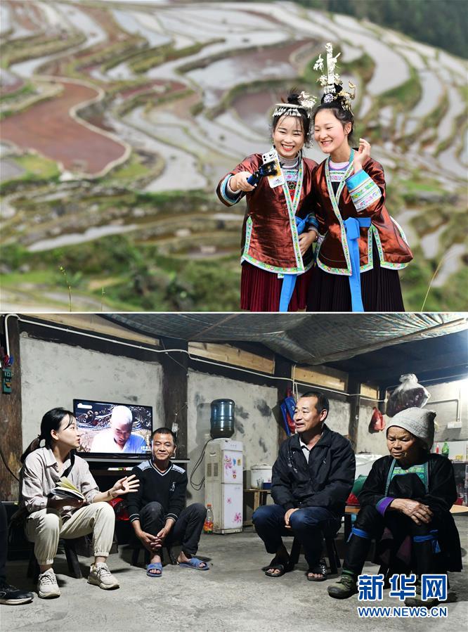 拼版照片上圖:吳賢艷(左)與村里的大一女生梁瓊英在直播推介加榜梯田風光(4月19日攝);下圖:吳賢艷(左一)夜訪貧困戶(4月18日攝)。從江縣是貴州省深度貧困縣之一。1994年出生的從江縣侗族女孩吳賢艷在2017年大學畢業(yè)后回到月亮山區(qū)。2019年3月,她成為從江縣加榜鄉(xiāng)加車村脫貧攻堅指揮所的一名網(wǎng)格員。吳賢艷和其他駐村干部不僅會主動幫助缺少勞動力的農(nóng)戶,還利用閑暇時間通過網(wǎng)絡平臺,向山外推介美麗的加榜梯田和苗寨風光,吸引更多的游客來旅游,為村民們脫貧增收出謀劃策。黨的十八大以來,我們堅持以人民為中心的發(fā)展思想,明確了到2020年我國現(xiàn)行標準下農(nóng)村貧困人口實現(xiàn)脫貧、貧困縣全部摘帽、解決區(qū)域性整體貧困的目標任務。目前看,脫貧進度符合預期,成就舉世矚目。這些成績的取得,凝聚了全黨全國各族人民智慧和心血,是廣大干部群眾扎扎實實干出來的。脫貧摘帽不是終點,而是新生活、新奮斗的起點。新華社記者楊文斌攝