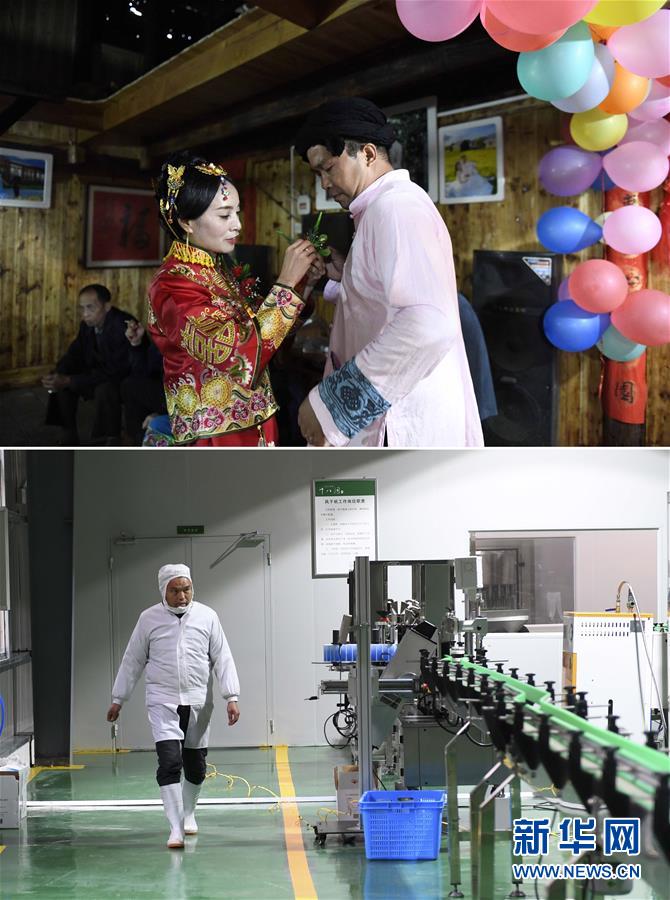 拼版照片上圖:婚禮開始前,吳春霞(左)為施六金佩戴胸花(2018年9月24日攝);下圖:施六金在十八洞村新建的山泉水廠里工作(2018年2月3日攝)。地處武陵山腹地的湖南湘西土家族苗族自治州花垣縣十八洞村曾深陷貧困。2013年,村里225戶中有136戶是貧困戶,40歲以上的“光棍兒”有30多人。2014年以來,十八洞村逐漸蛻變。2016年初,結(jié)束外出打工的施六金返鄉(xiāng)辦起“苗家樂”。2017年,村里的十八洞村山泉水廠正式建成投產(chǎn),他受聘成為廠里的技術工人,每月都有固定工資。隨著日子越過越好,許多像施六金這樣摘了窮帽的大齡“光棍兒”收獲了愛情,實現(xiàn)了安居樂業(yè),事業(yè)愛情雙豐收。黨的十八大以來,我們堅持以人民為中心的發(fā)展思想,明確了到2020年我國現(xiàn)行標準下農(nóng)村貧困人口實現(xiàn)脫貧、貧困縣全部摘帽、解決區(qū)域性整體貧困的目標任務。目前看,脫貧進度符合預期,成就舉世矚目。這些成績的取得,凝聚了全黨全國各族人民智慧和心血,是廣大干部群眾扎扎實實干出來的。脫貧摘帽不是終點,而是新生活、新奮斗的起點。新華社記者李尕攝