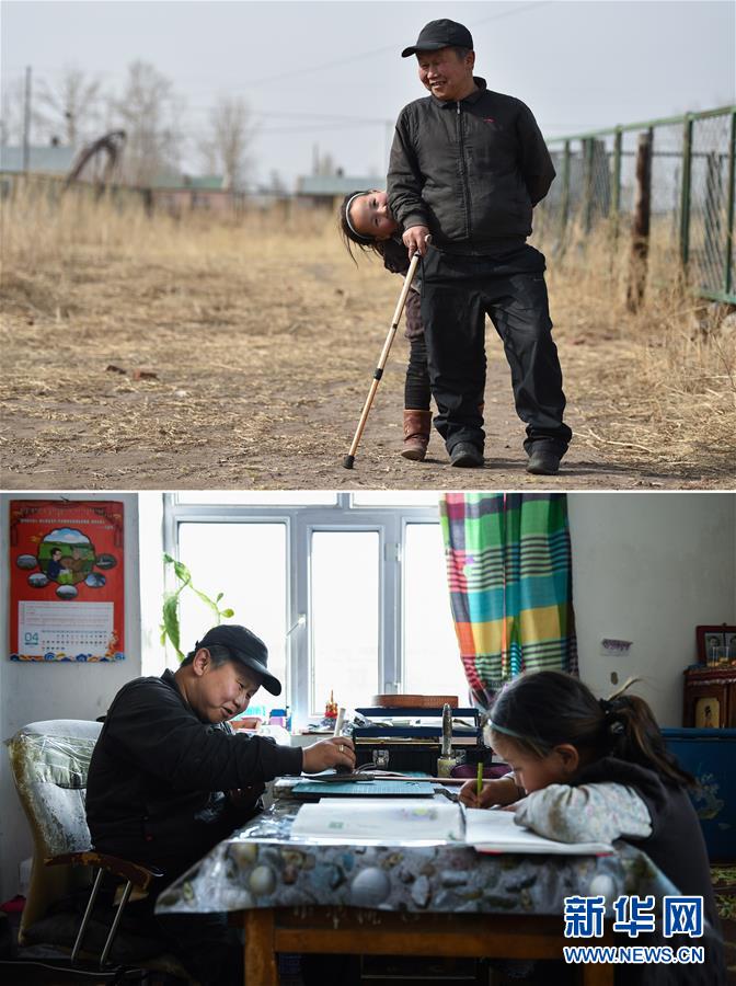 拼版照片上圖:在錫尼河鎮(zhèn)的出租房外,米格木爾(前)和女兒南吉樂瑪一起玩耍;下圖:在錫尼河鎮(zhèn)的出租房內(nèi),米格木爾在進行皮雕,女兒南吉樂瑪在溫習功課(照片均攝于4月15日)。2016年,家住內(nèi)蒙古鄂溫克族自治旗錫尼河鎮(zhèn)孟根礎魯嘎查的米格木爾因為缺失勞動能力成了建檔立卡貧困戶。獨自撫養(yǎng)女兒的他為了女兒上學離開了牧區(qū)來到鎮(zhèn)上租房陪讀,生活的壓力讓米格木爾犯了難。2018年春天,他通過當?shù)孛褡逦幕a(chǎn)業(yè)創(chuàng)業(yè)園舉辦的皮雕手藝培訓,讓他居家賺錢、陪讀兩不誤,逐步實現(xiàn)穩(wěn)定脫貧。2020年4月,我國第一個成立的少數(shù)民族自治區(qū)——內(nèi)蒙古自治區(qū)宣告全面脫貧“摘帽”。黨的十八大以來,我們堅持以人民為中心的發(fā)展思想,明確了到2020年我國現(xiàn)行標準下農(nóng)村貧困人口實現(xiàn)脫貧、貧困縣全部摘帽、解決區(qū)域性整體貧困的目標任務。目前看,脫貧進度符合預期,成就舉世矚目。這些成績的取得,凝聚了全黨全國各族人民智慧和心血,是廣大干部群眾扎扎實實干出來的。脫貧摘帽不是終點,而是新生活、新奮斗的起點。新華社記者劉磊攝