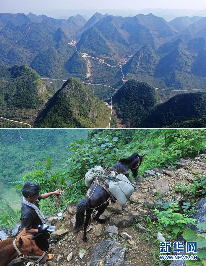 是一張拼版照片。上圖是已經(jīng)修通公路的大化瑤族自治縣板升鄉(xiāng)弄勇村弄為屯以及周邊村屯(2019年11月11日攝,無人機(jī)照片)。下圖:在弄勇村弄為屯,村民用馬將建筑材料馱回家,用于修建新房(2014年6月18日攝)。目前,包括弄為屯在內(nèi),弄勇村已基本實(shí)現(xiàn)屯屯通公路。新華社記者黃孝邦攝