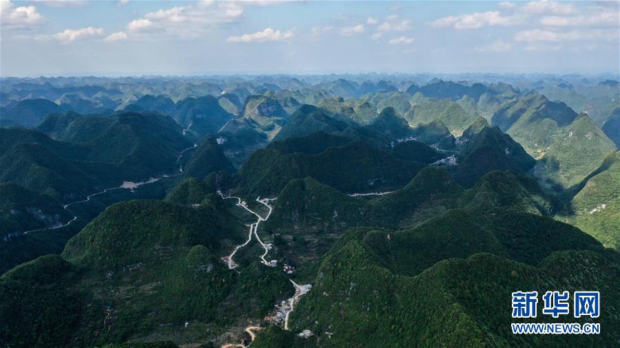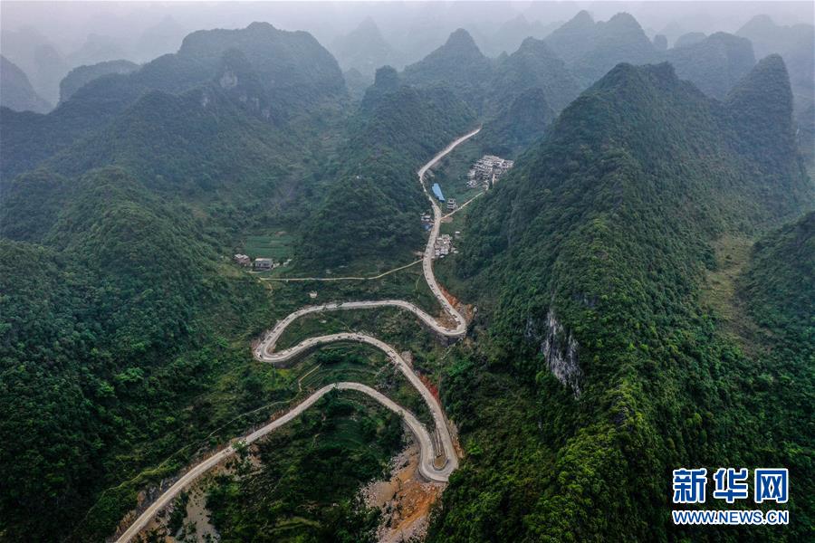 這是去年底通車的大化瑤族自治縣七百弄鄉(xiāng)江棟村那徐屯至弄獎屯公路(5月14日攝,無人機(jī)照片)。新華社記者曹祎銘攝