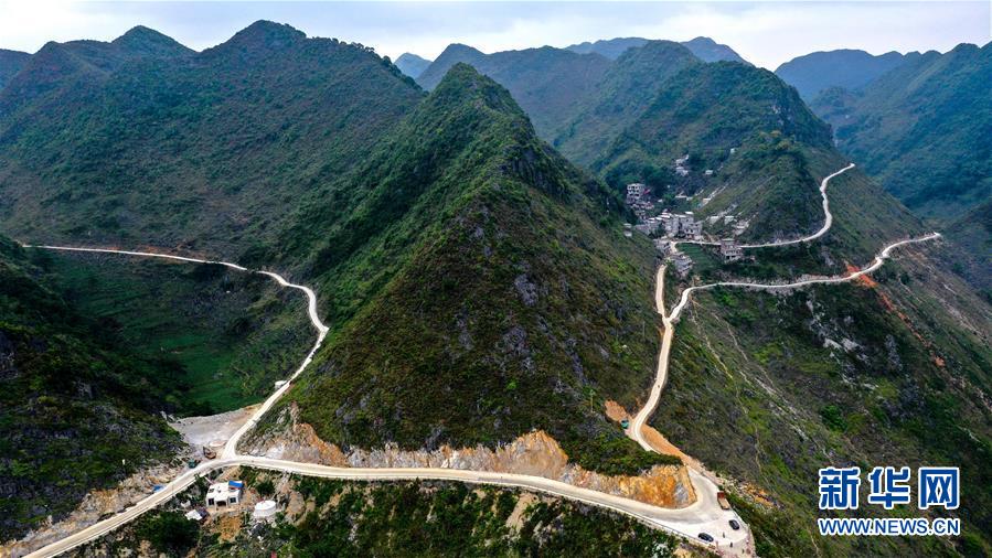 這是在進(jìn)行路面硬化的大化瑤族自治縣弄合村弄魯屯至弄確屯的山路(5月13日攝,無人機(jī)照片)。新華社記者周華攝
