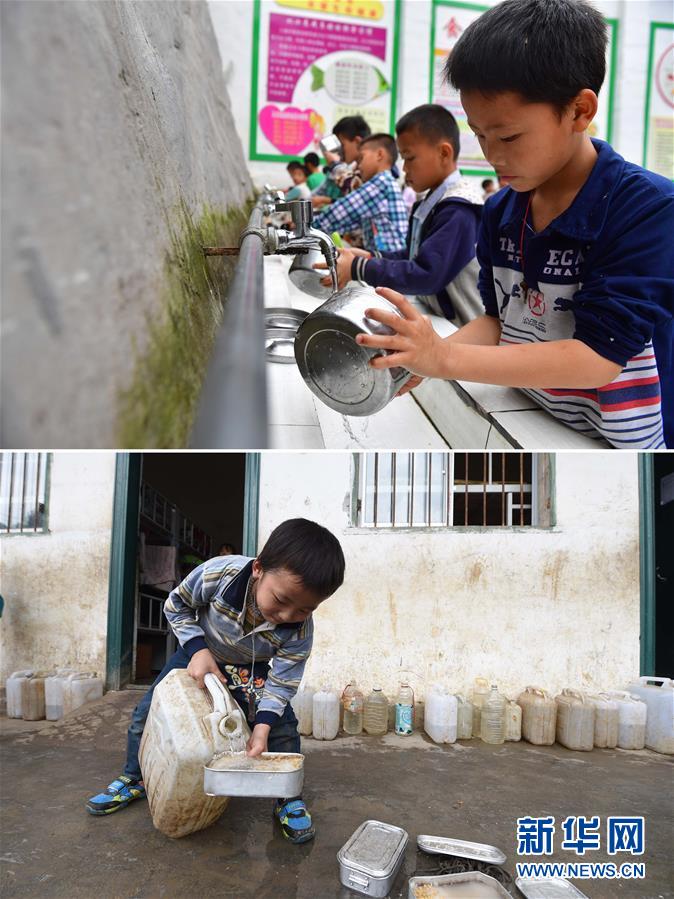 這是一張拼版照片。上圖:在大化瑤族自治縣板升鄉(xiāng)八好小學(xué),同學(xué)們在用泉水洗碗(2019年5月7日攝)。下圖:八好小學(xué)的同學(xué)們用儲備在水桶里的雨水淘米煮飯(2014年11月24日攝)。八好小學(xué)有400多名學(xué)生,曾僅有一個不足100立方米的水柜,用于收集儲存樓頂?shù)挠晁?,學(xué)生需定期定量用水。遇到長時間不下雨,學(xué)校需要到鄉(xiāng)政府所在地運(yùn)水。如今,學(xué)校修建了5個大水柜,并從兩公里外引泉水到校園,“飲水難”問題得到解決。新華社記者黃孝邦攝