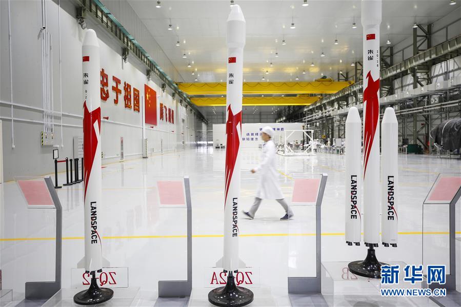 5月26日,工作人員走過藍箭航天智能制造基地發(fā)動機裝配區(qū)內的火箭模型。新華社記者張玉薇攝
