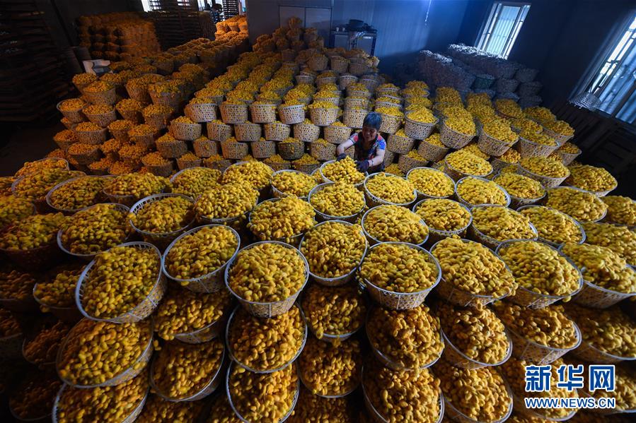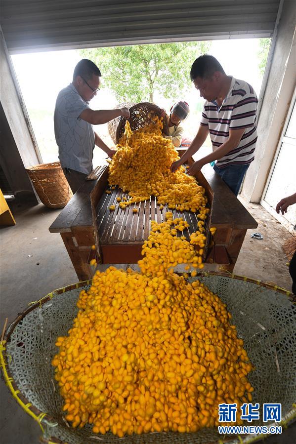 5月27日,桐鄉(xiāng)市鳳鳴街道建勝村70歲的村民宋柏明在收獲“黃金繭”。他今年在桐鄉(xiāng)興民蠶業(yè)專業(yè)合作社的指導(dǎo)下首次養(yǎng)3張黃金蠶繭種,收獲“黃金繭”近400斤,比往年同期增收1500元。近期,蠶桑之鄉(xiāng)浙江省桐鄉(xiāng)市的蠶農(nóng)們迎來(lái)了蠶繭豐收的季節(jié),其中新品種“黃金繭”的增收效果尤其明顯。據(jù)介紹,與普通蠶絲相比,色澤金黃的黃金蠶絲中葉黃素含量高,抗菌效果更好,深受市場(chǎng)青睞。2020年春季,浙江省桐鄉(xiāng)市共計(jì)發(fā)放黃金蠶繭種1225張,產(chǎn)量預(yù)計(jì)75噸,總產(chǎn)值近300萬(wàn)元,較普通蠶繭增收約20%,成為當(dāng)?shù)剞r(nóng)業(yè)增收的亮點(diǎn)。浙江省桐鄉(xiāng)市是我國(guó)蠶桑的重要產(chǎn)地,“桐鄉(xiāng)蠶桑習(xí)俗”也被國(guó)務(wù)院列入第二批國(guó)家級(jí)非物質(zhì)文化遺產(chǎn)名錄。新華社記者徐昱攝