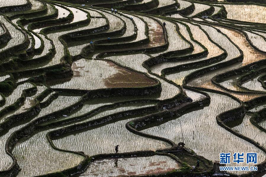 晨光中的從江縣加榜鄉(xiāng)加車梯田(5月27日攝)。夏日時(shí)節(jié),位于貴州省黔東南苗族侗族自治州從江縣加榜鄉(xiāng)加車、加頁、黨扭等苗寨的梯田在晨霧與陽光的映襯下線條分明,光影變幻,景色如畫。新華社記者 楊文斌 攝