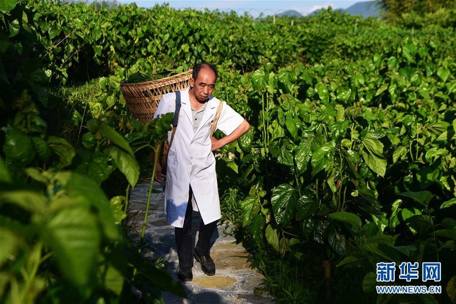5月29日,奉節(jié)縣新民鎮(zhèn)中嶺村蠶桑產業(yè)扶貧基地工作人員在背運桑葉。新華社記者 王全超 攝