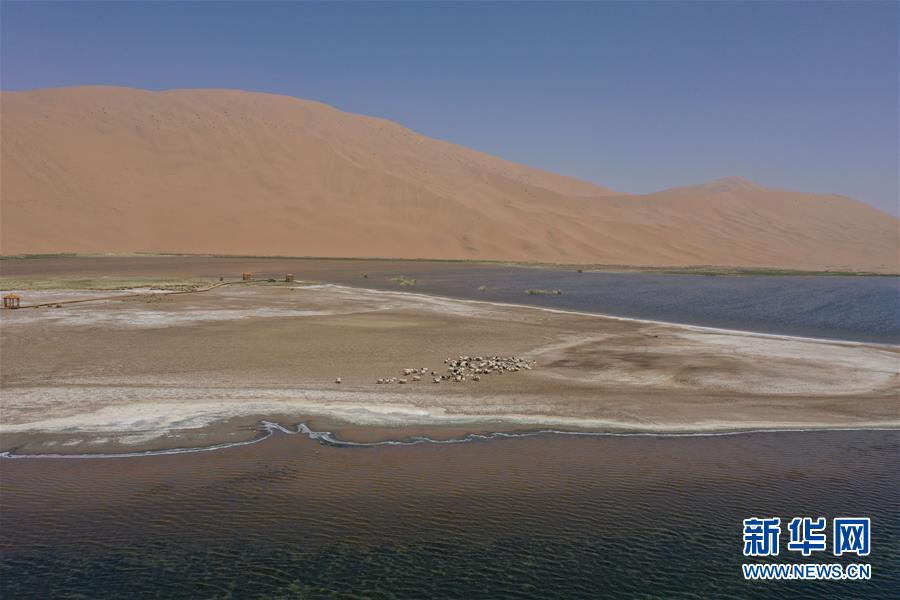 5月31日,羊群在巴丹吉林沙漠音德日圖湖湖畔休憩(無人機照片)。新華社記者徐欽攝。