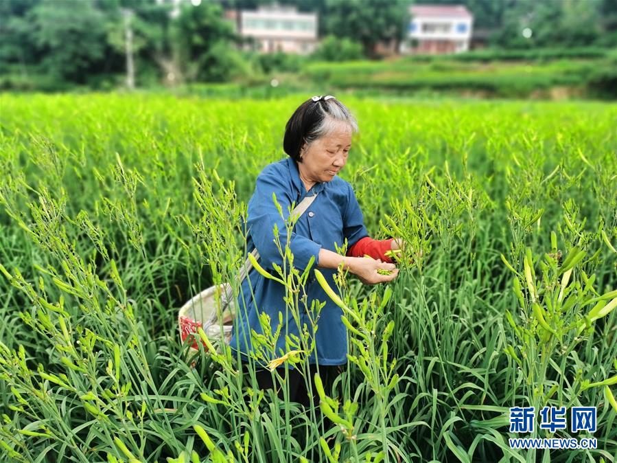 69歲的村民李蘇聯(lián)在祁東縣黃土鋪鎮(zhèn)采摘黃花菜(5月29日攝)。新華社記者謝櫻攝。