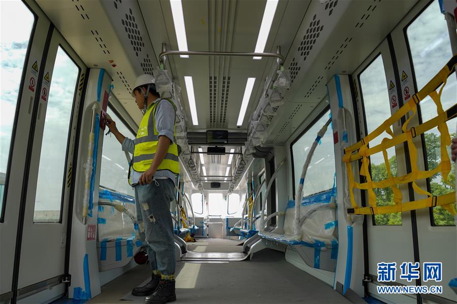 6月3日,工程技術(shù)人員在“云巴”車(chē)廂內(nèi)對(duì)安裝的電氣設(shè)備進(jìn)行調(diào)試。近日,重慶市首條“云巴”示范線項(xiàng)目在重慶璧山區(qū)正式亮相。此次發(fā)布的“云巴”采用電能驅(qū)動(dòng),具有轉(zhuǎn)彎半徑小、爬坡能力強(qiáng)、噪音低、安全性高、建設(shè)成本低、建造周期短等優(yōu)勢(shì),能為乘客提供更智能、舒適、便捷的出行體驗(yàn)。據(jù)介紹,璧山區(qū)“云巴”示范線項(xiàng)目自2019年8月開(kāi)建,線路正線全長(zhǎng)15.4km,共設(shè)車(chē)站15座,預(yù)計(jì)2020年9月全線通車(chē)。新華社記者劉潺攝。