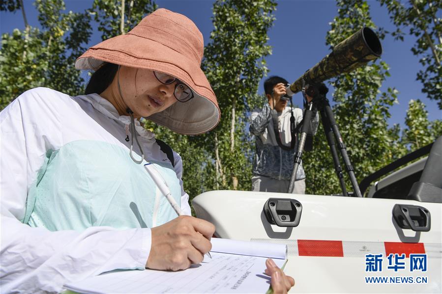 6月3日,李學(xué)明(左)和同事張海榮在監(jiān)測記錄黃河濕地的鳥類活動。新華社記者馮開華攝。