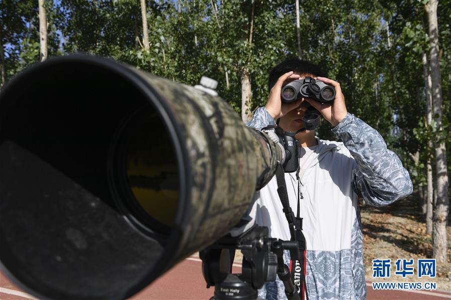 6月3日,李學(xué)明利用望遠鏡觀察黃河濕地的鳥類活動。新華社記者馮開華攝。
