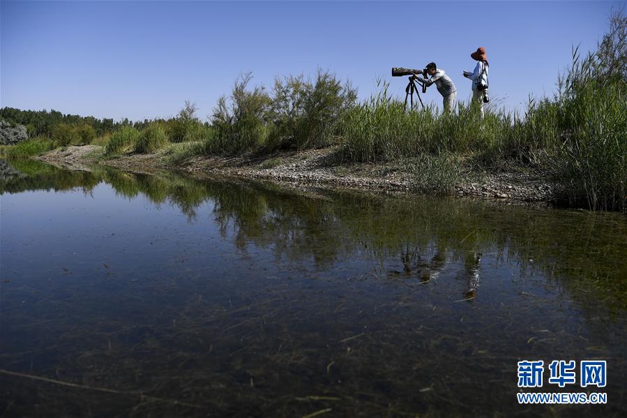 6月3日,李學(xué)明(左)和同事在黃河濕地監(jiān)測、拍攝鳥類活動。新華社記者馮開華攝。