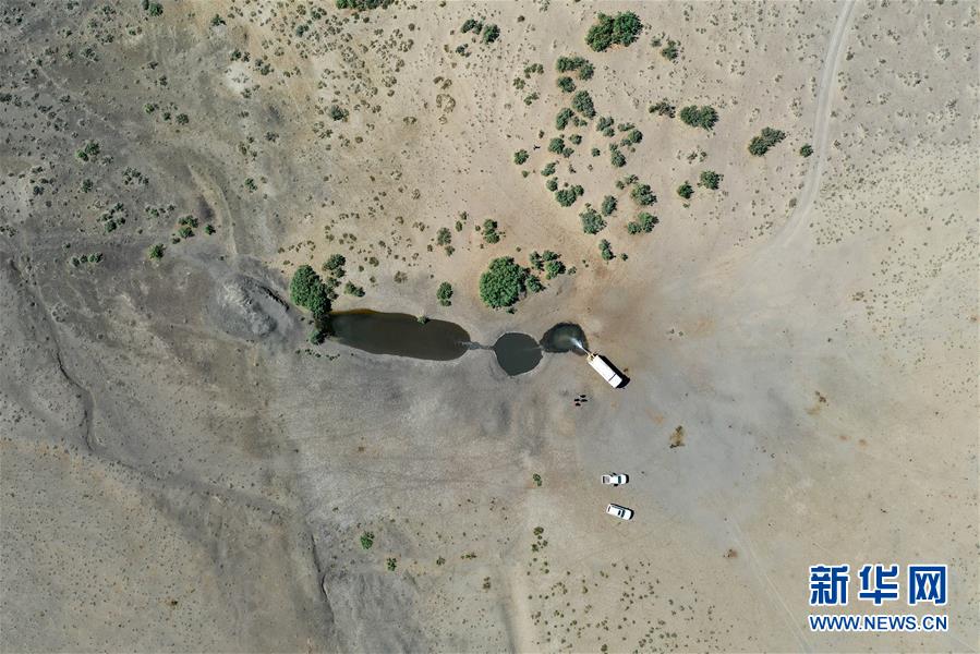 在新疆卡拉麥里山有蹄類野生動物自然保護區(qū),管護員為水源地灌水(6月3日攝,無人機照片)。新華社記者丁磊攝。