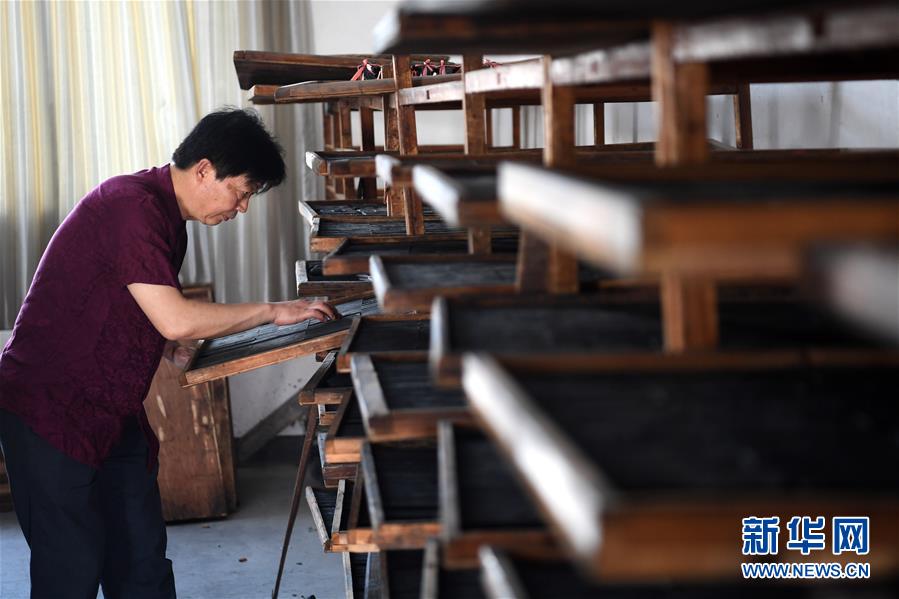5月20日,安徽省非物質(zhì)文化遺產(chǎn)徽墨代表性傳承人項(xiàng)德勝在查看通風(fēng)晾制的墨。新華社記者劉軍喜攝。