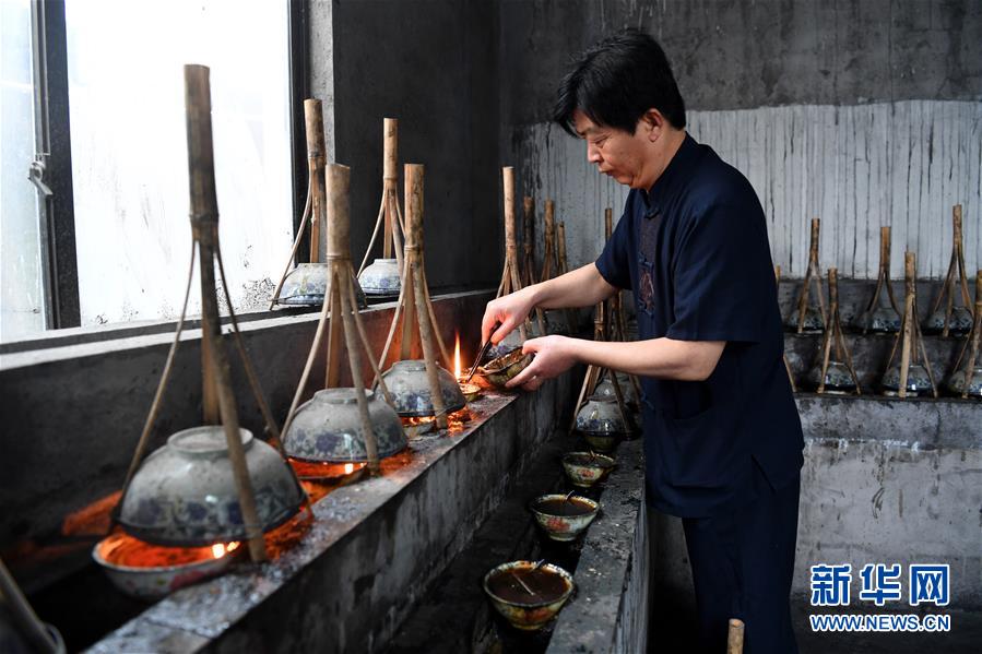 5月21日,安徽省非物質(zhì)文化遺產(chǎn)徽墨代表性傳承人項德勝在進行古法煉煙。傳統(tǒng)徽墨制作工藝中,第一道工序就是煉煙。這一過程收集來的油煙是徽墨制作中最為重要的原材料。新華社記者張端攝。