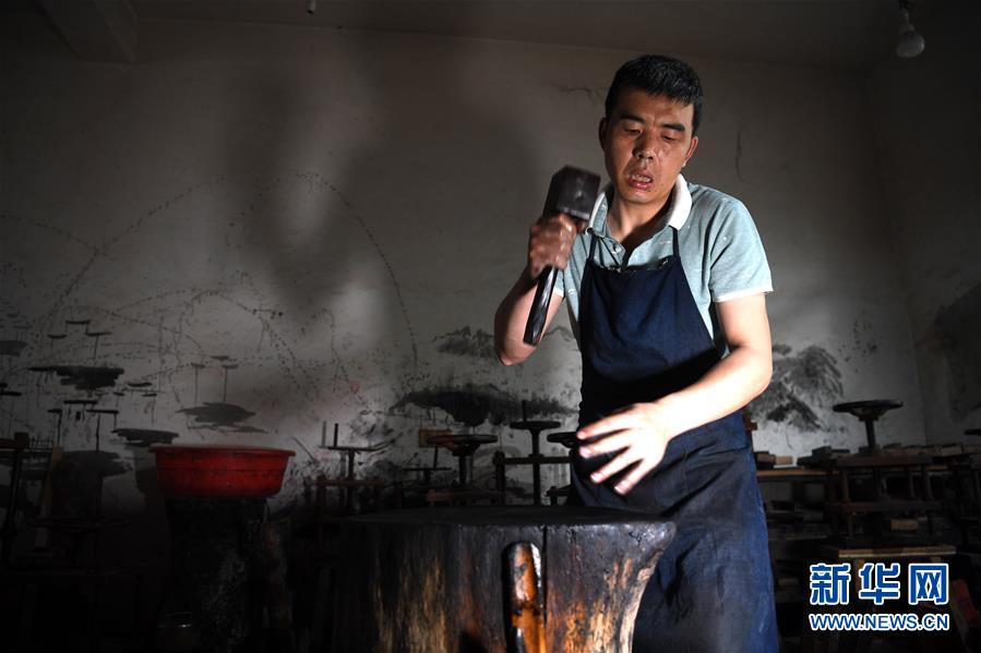 5月21日,安徽歙縣“項(xiàng)氏徽墨”的工人在捶打墨胚。新華社記者張端攝。