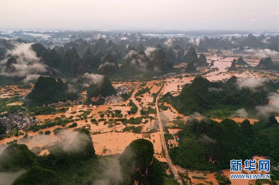 這是廣西陽(yáng)朔縣部分出現(xiàn)嚴(yán)重積水的村莊(6月7日攝,無(wú)人機(jī)照片)。